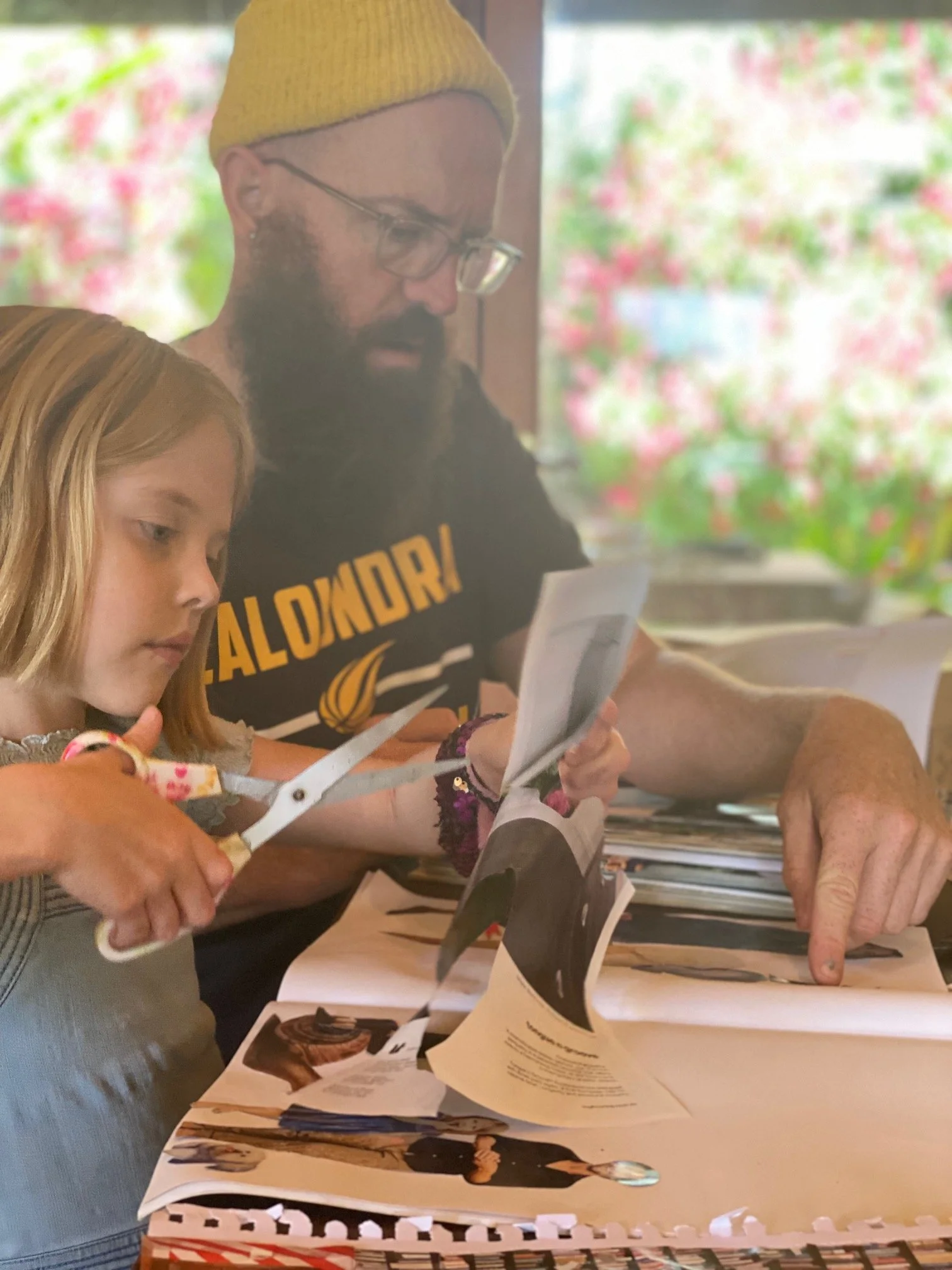 Our zero waste to landfill collage workshops, create space for all ages and skill levels to participate, collaborate or individuate (you do you). Empowered with glue and scissors, participants can quickly or slowly create deeply layered, personal artworks that are always fun.